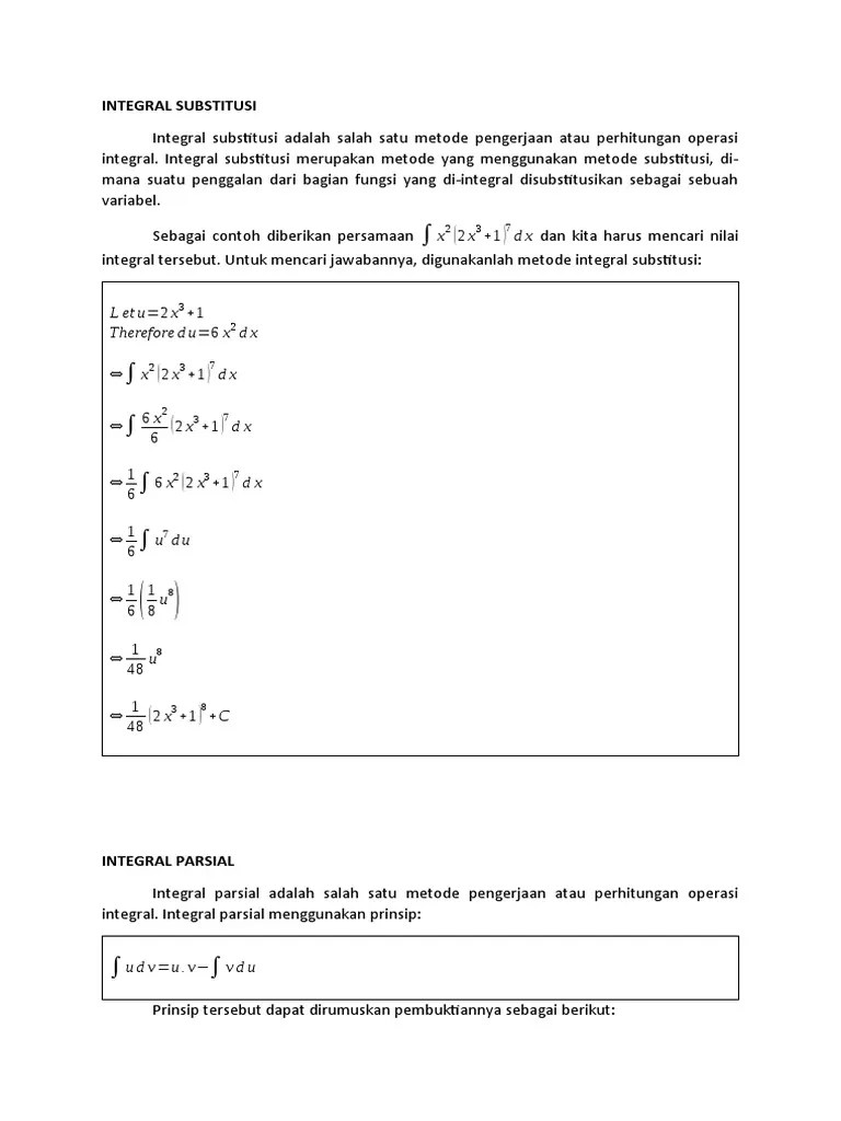 Integral substitusi yaitu metode yang digunakan pada persoalan integral dimana pada bagian fungsi adalah turunan dari fungsi yang lainnya. Kaidah ini berasal dari kaidah darab pada kalkulus diferensial. Pilih fungsi yang paling rumit/susah untuk. Coba anda kerjakan empat soal berikut! Kali ini saya akan membagi contoh soal soal dari integral substitusi dan integral parsial beserta dengan pembahasanya.
